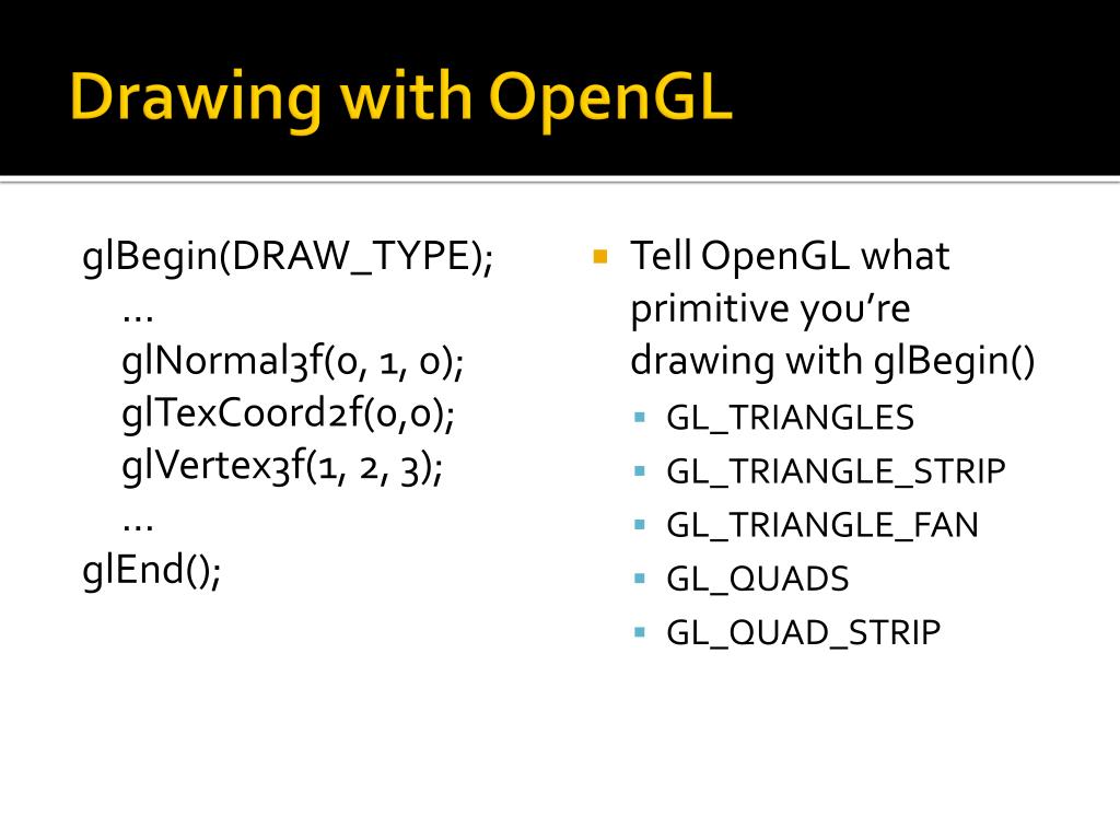 Drawing with OpenGL glBegin(DRAW_TYPE); … glNormal3f(0, 1, 0); glTexCoord2f(0,0); glVertex3f(1, 2, 3); … glEnd(); • Tell OpenGL what primitive you’re drawing with glBegin() • GL_TRIANGLES • GL_TRIANGLE_STRIP • GL_TRIANGLE_FAN • GL_QUADS • GL_QUAD_STRIP