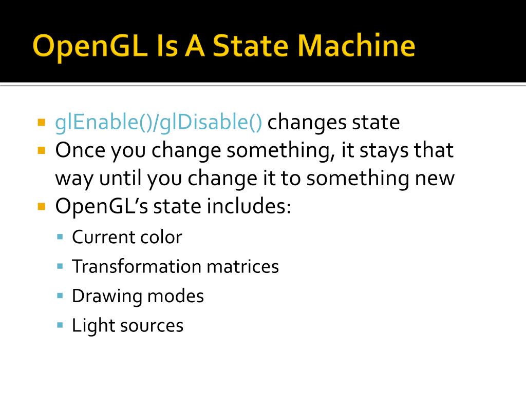 OpenGL Is A State Machine • glEnable()/glDisable() changes state • Once you change something, it stays that way until you change it to something new • OpenGL’s state includes: • Current color • Transformation matrices • Drawing modes • Light sources
