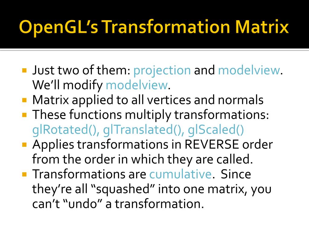 OpenGL’s Transformation Matrix • Just two of them: projection and modelview. We’ll modify modelview. • Matrix applied to all vertices and normals • These functions multiply transformations: glRotated(), glTranslated(), glScaled() • Applies transformations in REVERSE order from the order in which they are called. • Transformations are cumulative. Since they’re all “squashed” into one matrix, you can’t “undo” a transformation.
