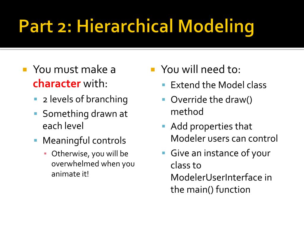 Part 2: Hierarchical Modeling • You must make a character with: • 2 levels of branching • Something drawn at each level • Meaningful controls • Otherwise, you will be overwhelmed when you animate it! • You will need to: • Extend the Model class • Override the draw() method • Add properties that Modeler users can control • Give an instance of your class to ModelerUserInterface in the main() function