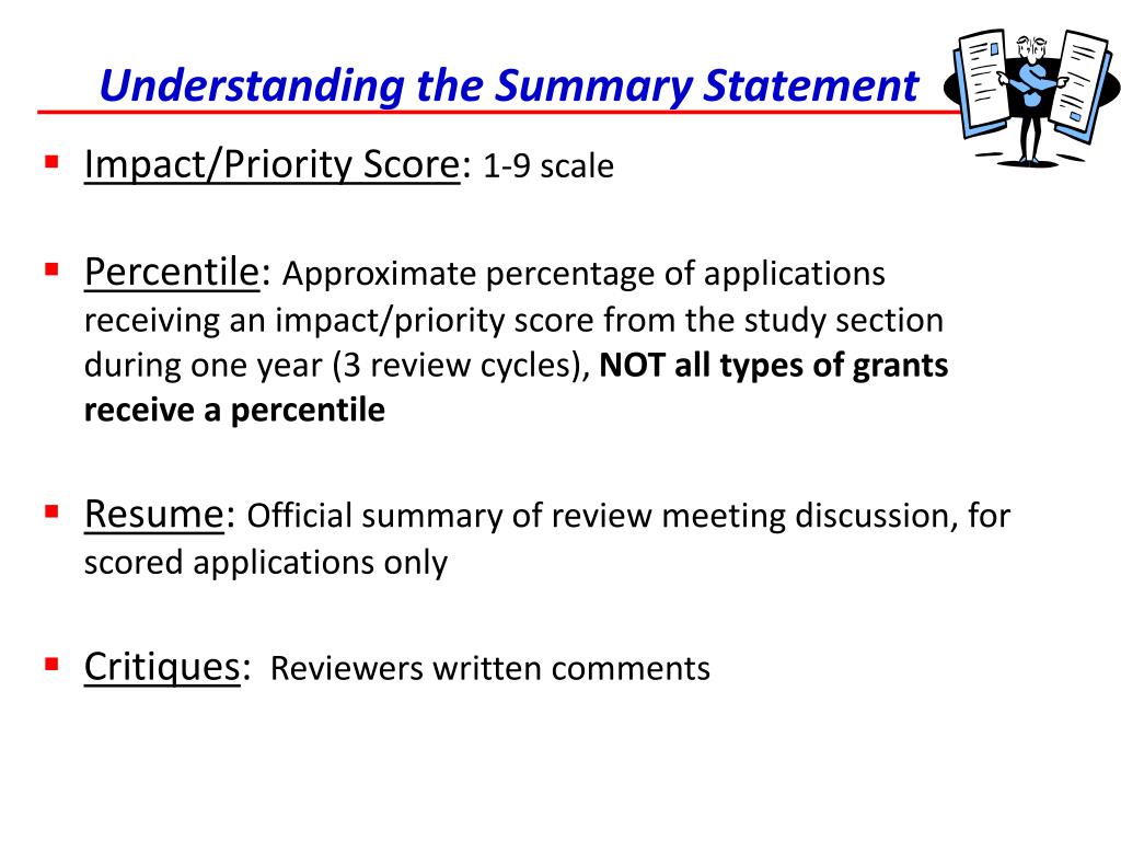 Understanding the Summary Statement • Impact/Priority Score: 1-9 scale • Percentile: Approximate percentage of applications receiving an impact/priority score from the study section during one year (3 review cycles), NOT all types of grants receive a percentile • Resume: Official summary of review meeting discussion, for scored applications only • Critiques: Reviewers written comments