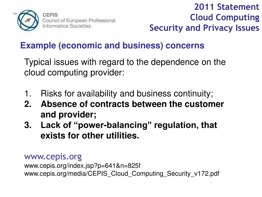 2011 StatementCloud ComputingSecurity and Privacy Issues Example (economic and business) concerns Typical issues with regard to the dependence on the cloud computing provider: • Risks for availability and business continuity; • Absence of contracts between the customer and provider; • Lack of “power-balancing” regulation, that exists for other utilities. • www.cepis.org • www.cepis.org/index.jsp?p=641&n=825f • www.cepis.org/media/CEPIS_Cloud_Computing_Security_v172.pdf