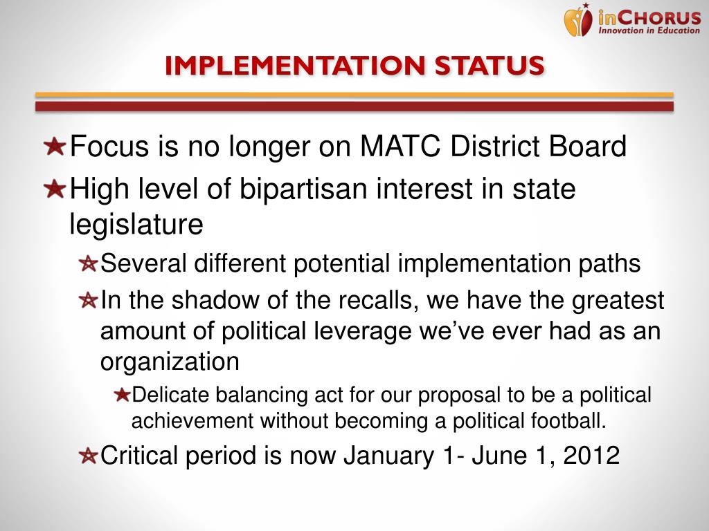 Implementation status • Focus is no longer on MATC District Board • High level of bipartisan interest in state legislature • Several different potential implementation paths • In the shadow of the recalls, we have the greatest amount of political leverage we’ve ever had as an organization • Delicate balancing act for our proposal to be a political achievement without becoming a political football. • Critical period is now January 1- June 1, 2012