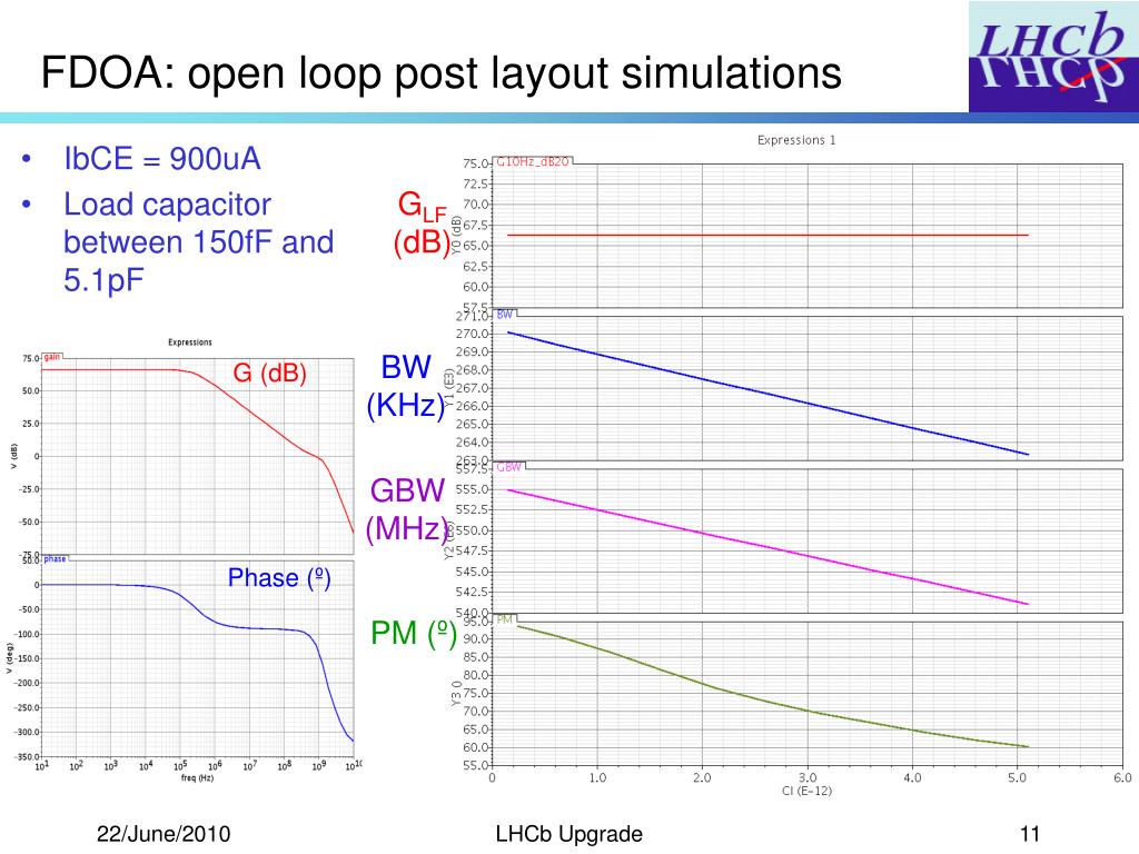 FDOA: open loop post layout simulations • IbCE = 900uA • Load capacitor between 150fF and 5.1pF GLF (dB) BW (KHz) G (dB) GBW (MHz) Phase (º) PM (º) LHCb Upgrade