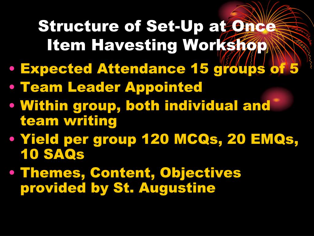 Structure of Set-Up at Once Item Havesting Workshop • Expected Attendance 15 groups of 5 • Team Leader Appointed • Within group, both individual and team writing • Yield per group 120 MCQs, 20 EMQs, 10 SAQs • Themes, Content, Objectives provided by St. Augustine