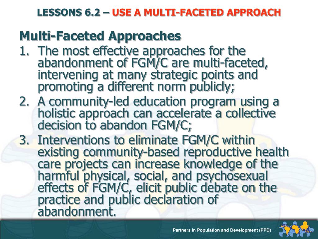 LESSONS 6.2 – USE A MULTI-FACETED APPROACH Multi-Faceted Approaches The most effective approaches for the abandonment of FGM/C are multi-faceted, intervening at many strategic points and promoting a different norm publicly; A community-led education program using a holistic approach can accelerate a collective decision to abandon FGM/C; Interventions to eliminate FGM/C within existing community-based reproductive health care projects can increase knowledge of the harmful physical, social, and psychosexual effects of FGM/C, elicit public debate on the practice and public declaration of abandonment.