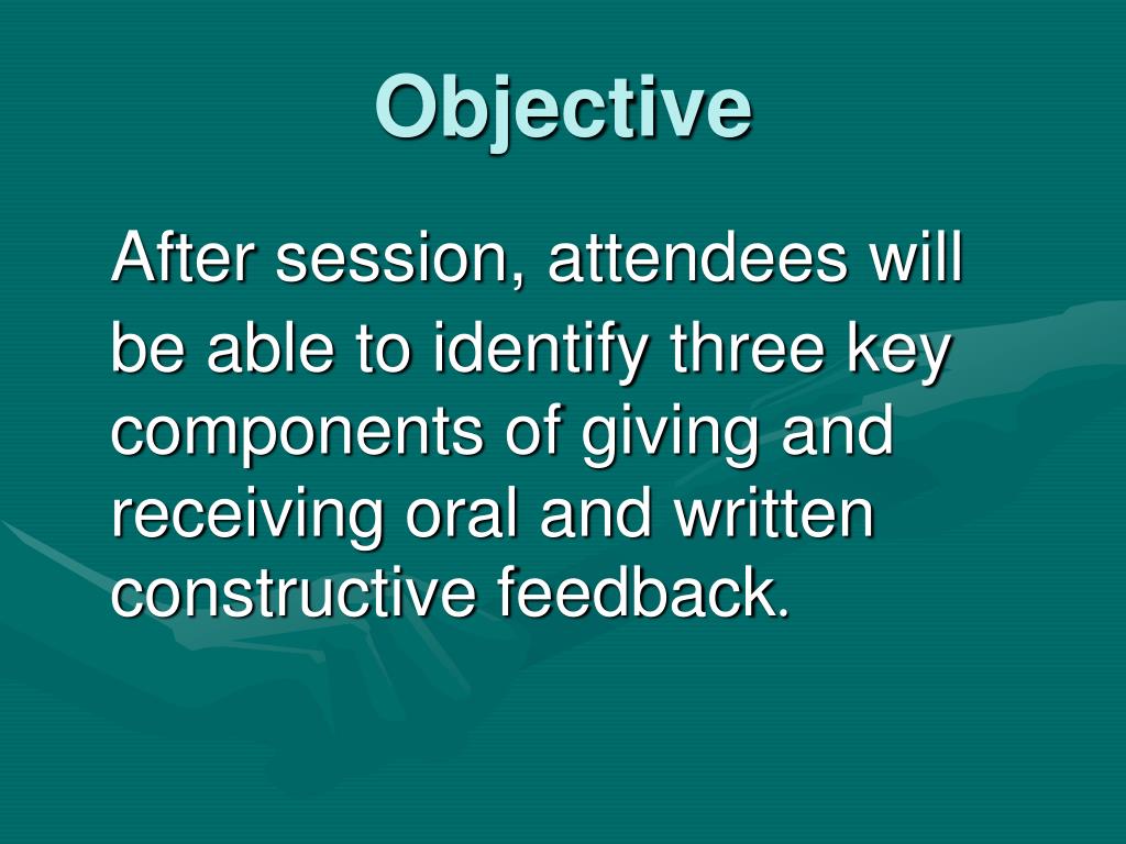 Objective After session, attendees will be able to identify three key components of giving and receiving oral and written constructive feedback.