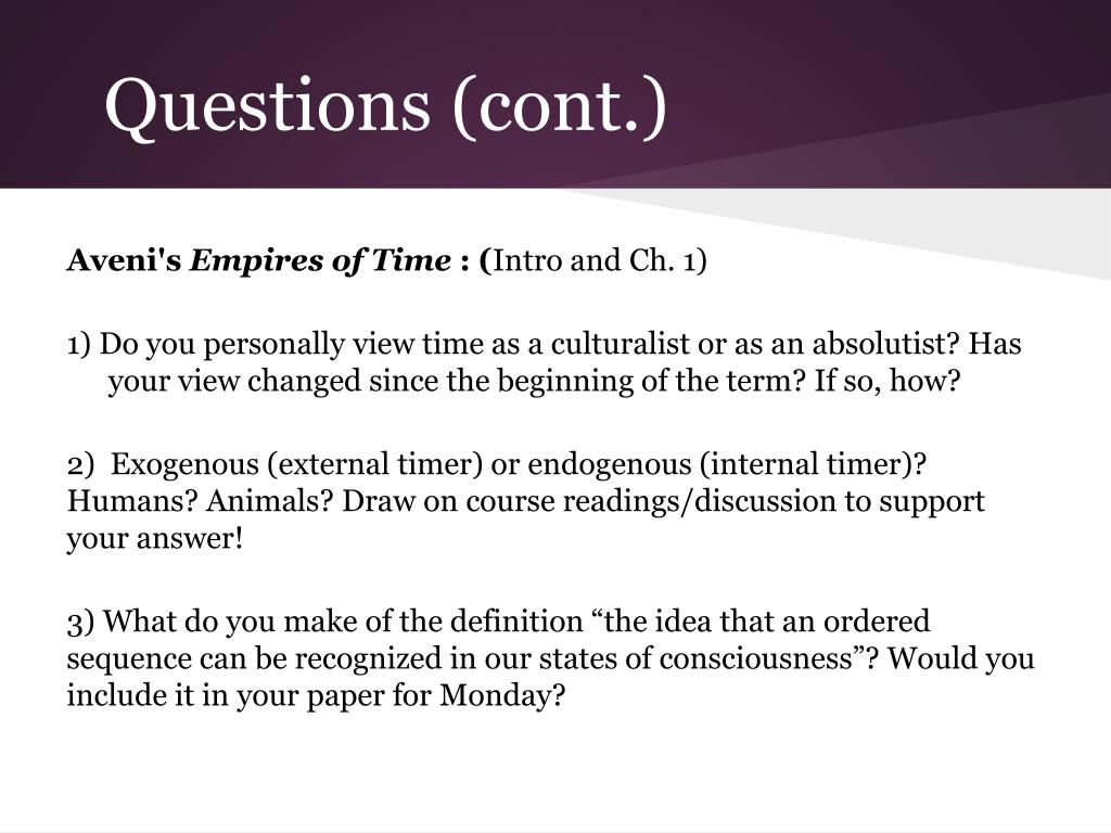 Questions (cont.) Aveni's Empires of Time : (Intro and Ch. 1) 1) Do you personally view time as a culturalist or as an absolutist? Has your view changed since the beginning of the term? If so, how? 2) Exogenous (external timer) or endogenous (internal timer)? Humans? Animals? Draw on course readings/discussion to support your answer! 3) What do you make of the definition “the idea that an ordered sequence can be recognized in our states of consciousness”? Would you include it in your paper for Monday?