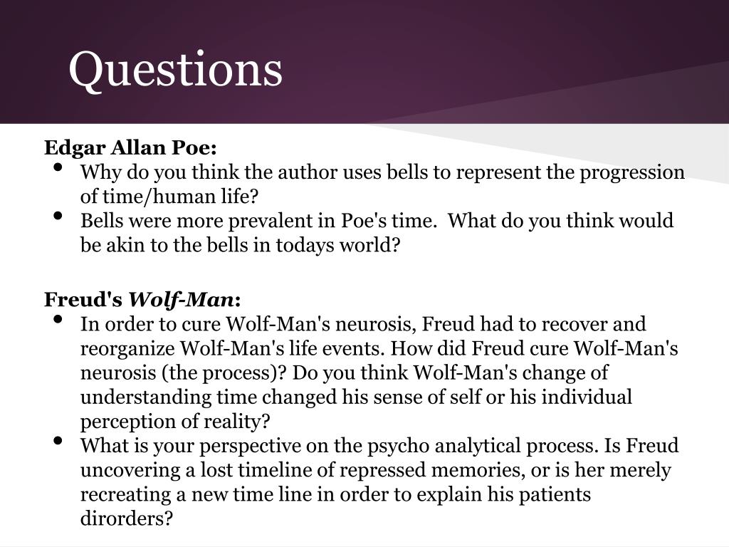 Questions Edgar Allan Poe: • Why do you think the author uses bells to represent the progression of time/human life? • Bells were more prevalent in Poe's time. What do you think would be akin to the bells in todays world? Freud's Wolf-Man: • In order to cure Wolf-Man's neurosis, Freud had to recover and reorganize Wolf-Man's life events. How did Freud cure Wolf-Man's neurosis (the process)? Do you think Wolf-Man's change of understanding time changed his sense of self or his individual perception of reality? • What is your perspective on the psycho analytical process. Is Freud uncovering a lost timeline of repressed memories, or is her merely recreating a new time line in order to explain his patients dirorders?