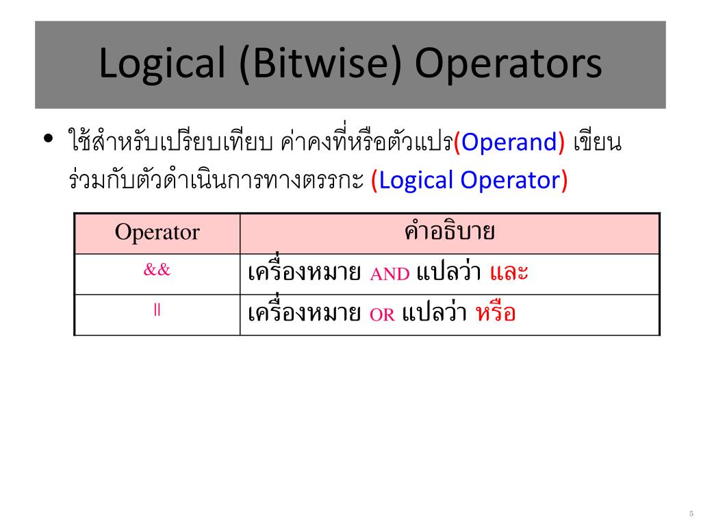 Logical (Bitwise) Operators • ใช้สำหรับเปรียบเทียบ ค่าคงที่หรือตัวแปร(Operand) เขียนร่วมกับตัวดำเนินการทางตรรกะ (LogicalOperator)