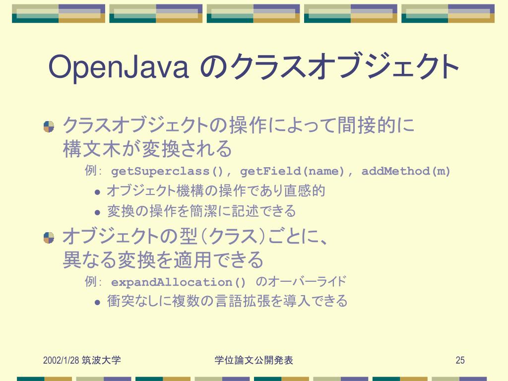 OpenJava のクラスオブジェクト • クラスオブジェクトの操作によって間接的に構文木が変換される 例:getSuperclass(), getField(name), addMethod(m) • オブジェクト機構の操作であり直感的 • 変換の操作を簡潔に記述できる • オブジェクトの型(クラス)ごとに、異なる変換を適用できる 例:expandAllocation() のオーバーライド • 衝突なしに複数の言語拡張を導入できる 学位論文公開発表