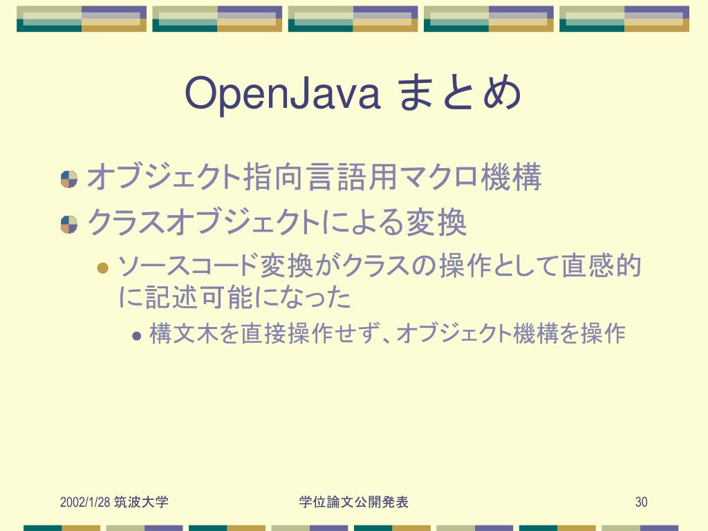 OpenJava まとめ • オブジェクト指向言語用マクロ機構 • クラスオブジェクトによる変換 • ソースコード変換がクラスの操作として直感的に記述可能になった • 構文木を直接操作せず、オブジェクト機構を操作 学位論文公開発表