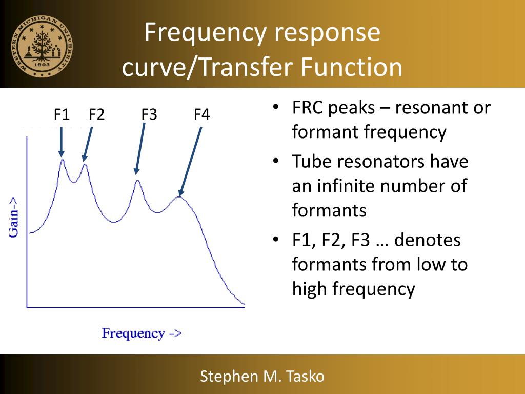 FRC peaks – resonant or formant frequency Tube resonators have an infinite number of formants F1, F2, F3 … denotes formants from low to high frequency Frequency response curve/Transfer Function F1 F2 F3 F4 Stephen M. Tasko