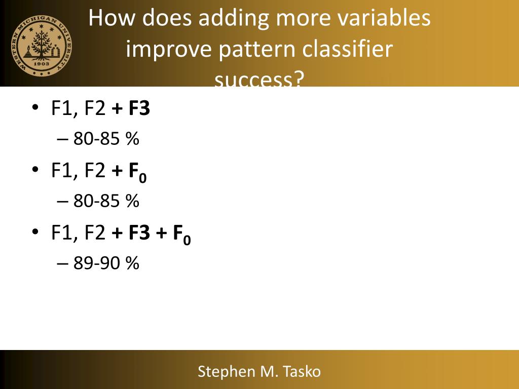 How does adding more variables improve pattern classifier success? • F1, F2 + F3 • 80-85 % • F1, F2 + F0 • 80-85 % • F1, F2 + F3 + F0 • 89-90 % Stephen M. Tasko