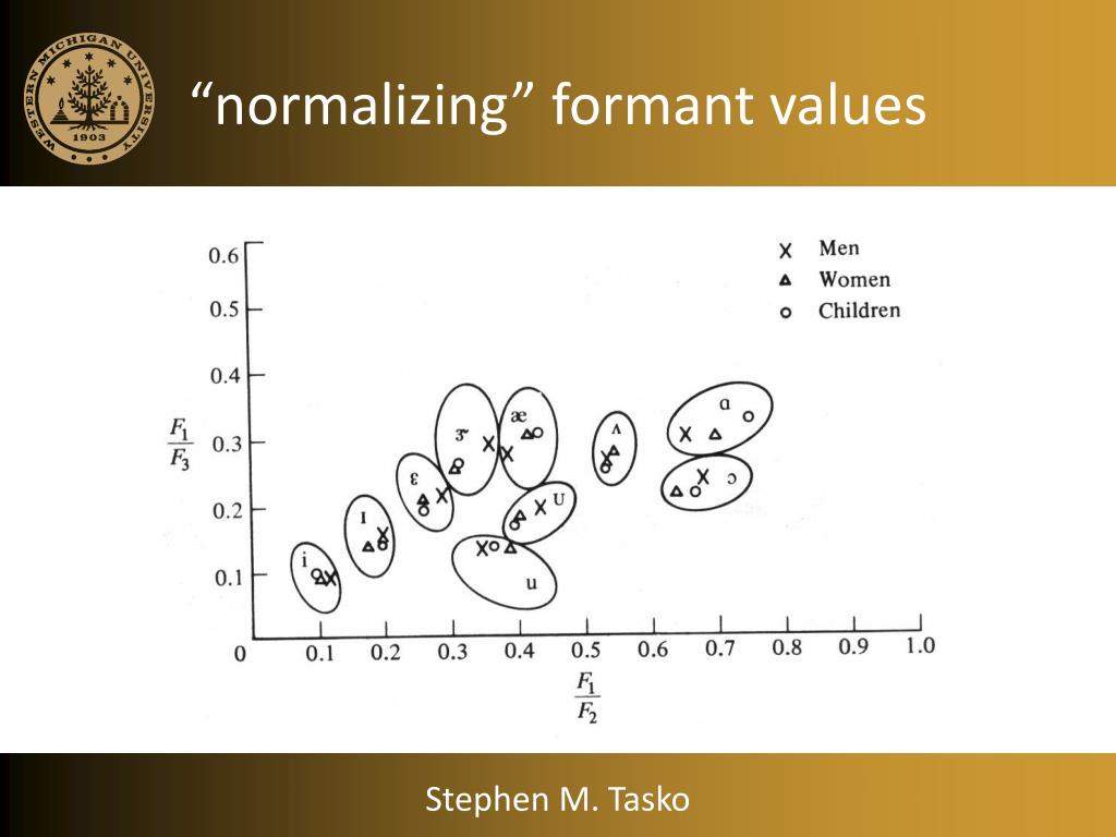 Learning Objectives • Provide an explanation for why we treat women’s, men’s and children’s vowels as equivalent even though absolute values of formants differ a lot. Stephen M. Tasko