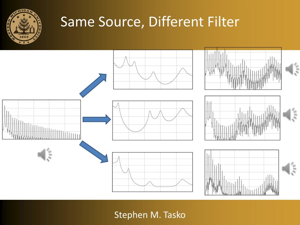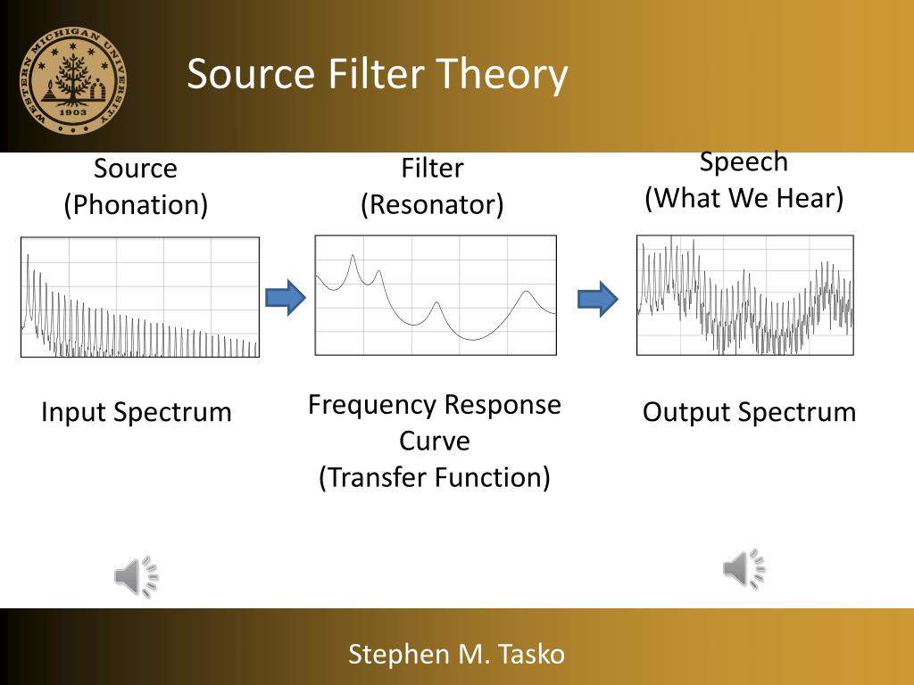 Source Filter Theory Speech (What We Hear) Filter (Resonator) Source (Phonation) Frequency Response Curve (Transfer Function) Input Spectrum Output Spectrum Stephen M. Tasko