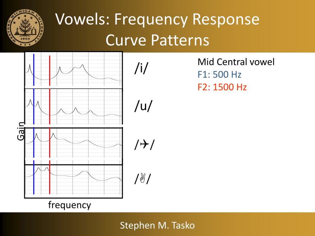 Vowels: Frequency Response Curve Patterns Mid Central vowel F1: 500 Hz F2: 1500 Hz /i/ Gain /u/ // // Stephen M. Tasko frequency