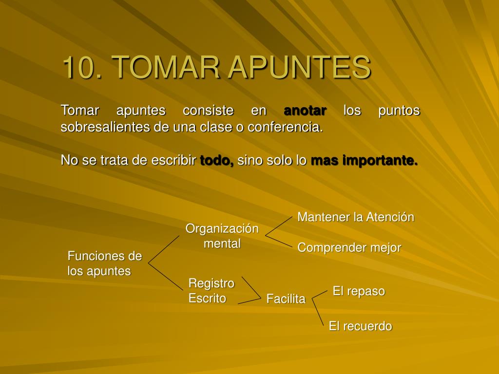 10. TOMAR APUNTES Tomar apuntes consiste en anotar los puntos sobresalientes de una clase o conferencia. No se trata de escribir todo, sino solo lo mas importante. Mantener la Atención Organización mental Comprender mejor Funciones de los apuntes Registro Escrito El repaso Facilita El recuerdo
