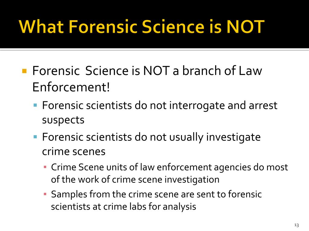 What Forensic Science is NOT • Forensic Science is NOT a branch of Law Enforcement! • Forensic scientists do not interrogate and arrest suspects • Forensic scientists do not usually investigate crime scenes • Crime Scene units of law enforcement agencies do most of the work of crime scene investigation • Samples from the crime scene are sent to forensic scientists at crime labs for analysis