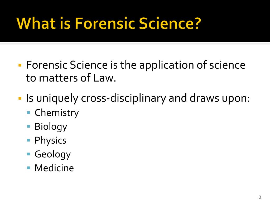 What is Forensic Science? • Forensic Science is the application of science to matters of Law. • Is uniquely cross-disciplinary and draws upon: • Chemistry • Biology • Physics • Geology • Medicine