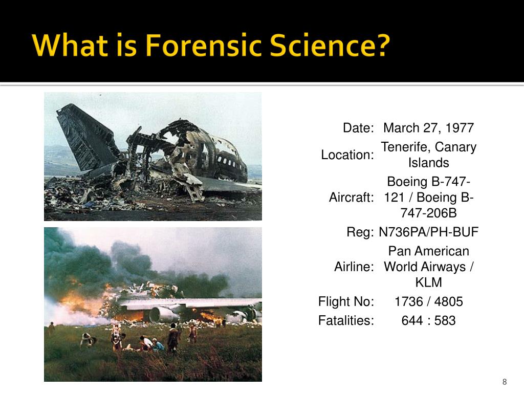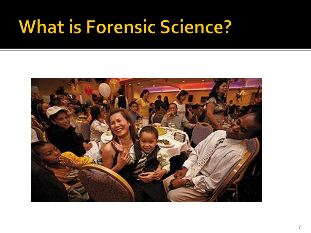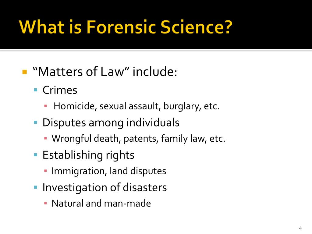 What is Forensic Science? • “Matters of Law” include: • Crimes • Homicide, sexual assault, burglary, etc. • Disputes among individuals • Wrongful death, patents, family law, etc. • Establishing rights • Immigration, land disputes • Investigation of disasters • Natural and man-made