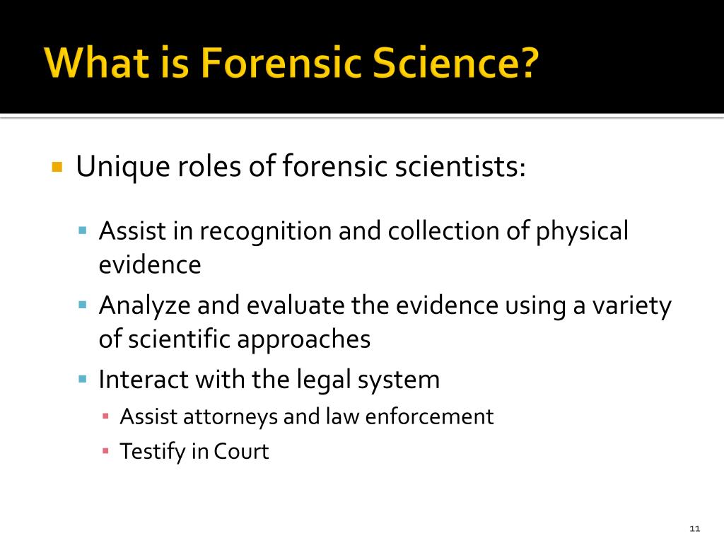 What is Forensic Science? • Unique roles of forensic scientists: • Assist in recognition and collection of physical evidence • Analyze and evaluate the evidence using a variety of scientific approaches • Interact with the legal system • Assist attorneys and law enforcement • Testify in Court