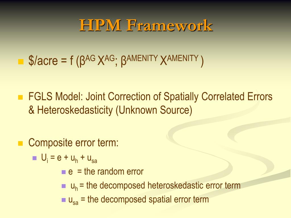 HPM Framework • $/acre = f (βAGXAG; βAMENITYXAMENITY) • FGLS Model: Joint Correction of Spatially Correlated Errors & Heteroskedasticity (Unknown Source) • Composite error term: • Ui = e + uh + usa • e = the random error • uh = the decomposed heteroskedastic error term • usa = the decomposed spatial error term