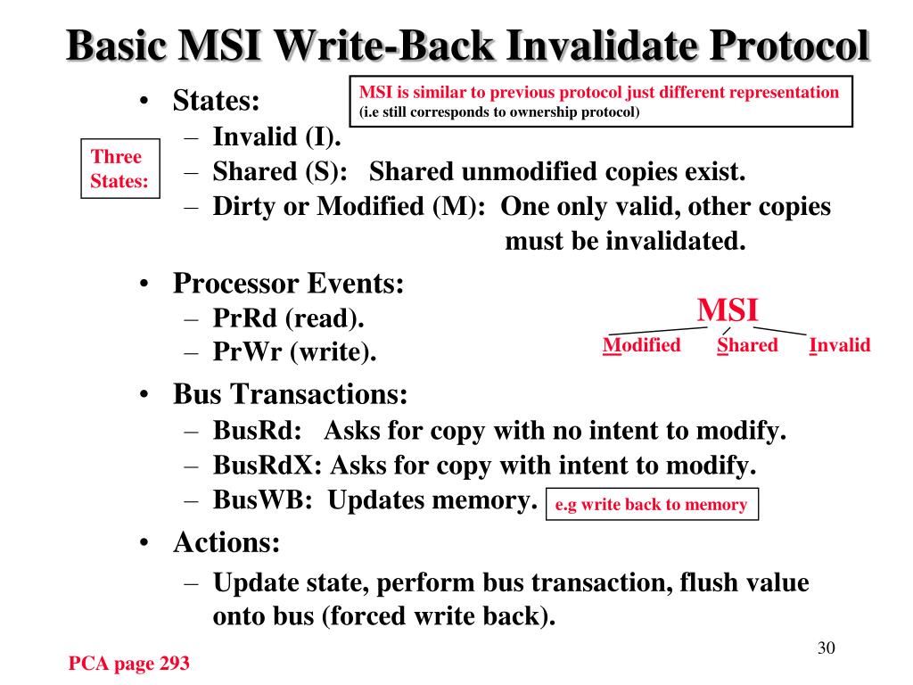 Basic MSI Write-Back Invalidate Protocol MSI is similar to previous protocol just different representation (i.e still corresponds to ownership protocol) • States: • Invalid (I). • Shared (S): Shared unmodified copies exist. • Dirty or Modified (M): One only valid, other copies must be invalidated. • Processor Events: • PrRd (read). • PrWr (write). • Bus Transactions: • BusRd: Asks for copy with no intent to modify. • BusRdX: Asks for copy with intent to modify. • BusWB: Updates memory. • Actions: • Update state, perform bus transaction, flush value onto bus (forced write back). Three States: MSI Modified Shared Invalid e.g write back to memory PCA page 293