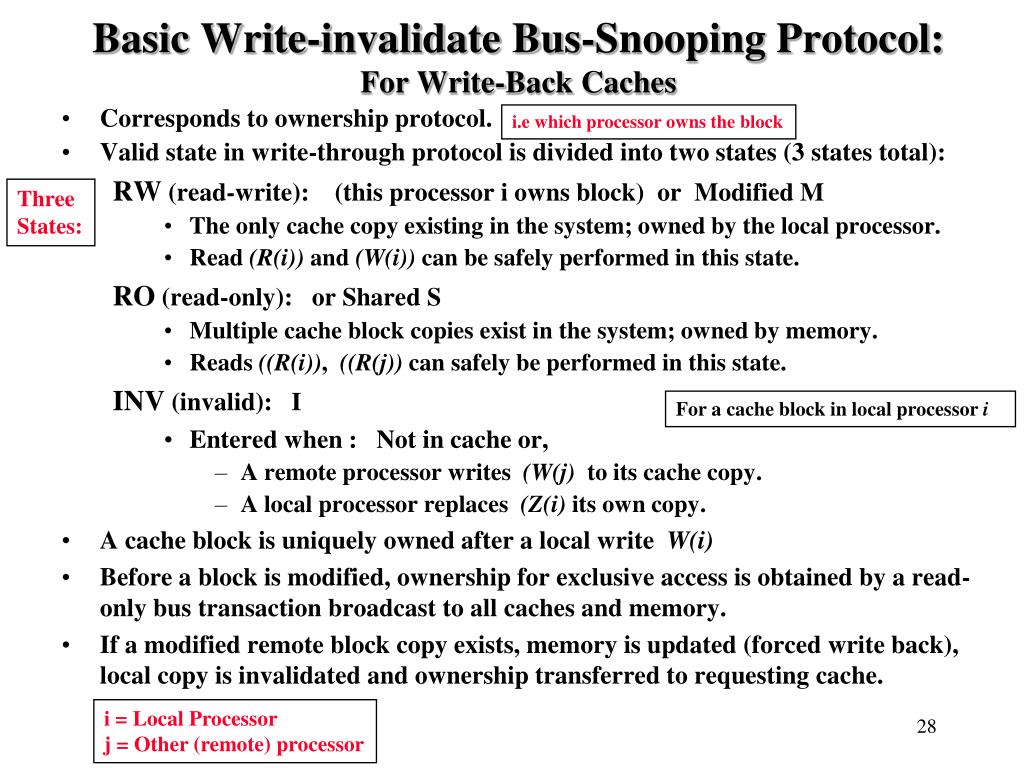 Basic Write-invalidate Bus-Snooping Protocol:For Write-Back Caches i.e which processor owns the block • Corresponds to ownership protocol. • Valid state in write-through protocol is divided into two states (3 states total): RW (read-write): (this processor i owns block) or Modified M • The only cache copy existing in the system; owned by the local processor. • Read (R(i)) and (W(i)) can be safely performed in this state. RO (read-only): or Shared S • Multiple cache block copies exist in the system; owned by memory. • Reads ((R(i)), ((R(j)) can safely be performed in this state. INV (invalid): I • Entered when : Not in cache or, • A remote processor writes (W(j) to its cache copy. • A local processor replaces (Z(i) its own copy. • A cache block is uniquely owned after a local write W(i) • Before a block is modified, ownership for exclusive access is obtained by a read-only bus transaction broadcast to all caches and memory. • If a modified remote block copy exists, memory is updated (forced write back), local copy is invalidated and ownership transferred to requesting cache. Three States: For a cache block in local processor i i = Local Processor j = Other (remote) processor