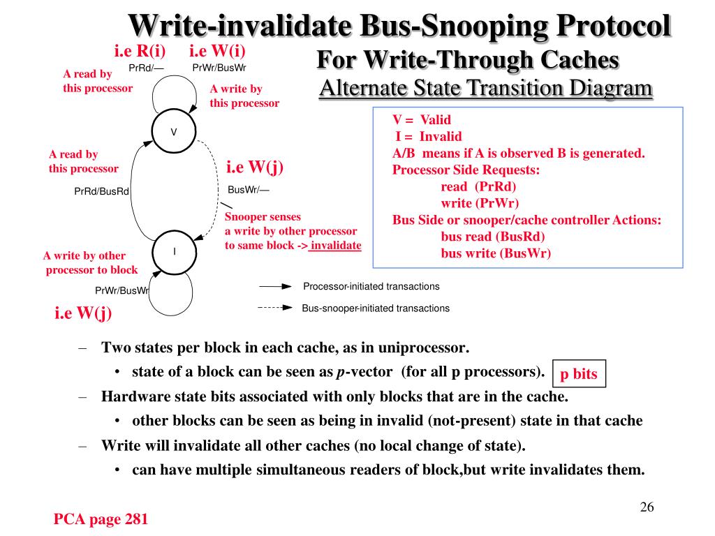 PrW r/BusW r PrRd/— V = Valid I = Invalid A/B means if A is observed B is generated. Processor Side Requests: read (PrRd) write (PrWr) Bus Side or snooper/cache controller Actions: bus read (BusRd) bus write (BusWr) V BusW r/— PrRd/BusRd I Pr ocessor -initiated transactions PrW r/BusW r Bus-snooper -initiated transactions Write-invalidate Bus-Snooping ProtocolFor Write-Through Caches i.e R(i) i.e W(i) A read by this processor Alternate State Transition Diagram A write by this processor • Two states per block in each cache, as in uniprocessor. • state of a block can be seen as p-vector (for all p processors). • Hardware state bits associated with only blocks that are in the cache. • other blocks can be seen as being in invalid (not-present) state in that cache • Write will invalidate all other caches (no local change of state). • can have multiple simultaneous readers of block,but write invalidates them. A read by this processor i.e W(j) Snooper senses a write by other processor to same block -> invalidate A write by other processor to block i.e W(j) p bits PCA page 281
