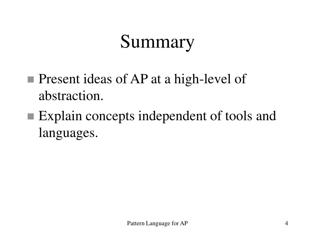 Summary • Present ideas of AP at a high-level of abstraction. • Explain concepts independent of tools and languages. Pattern Language for AP