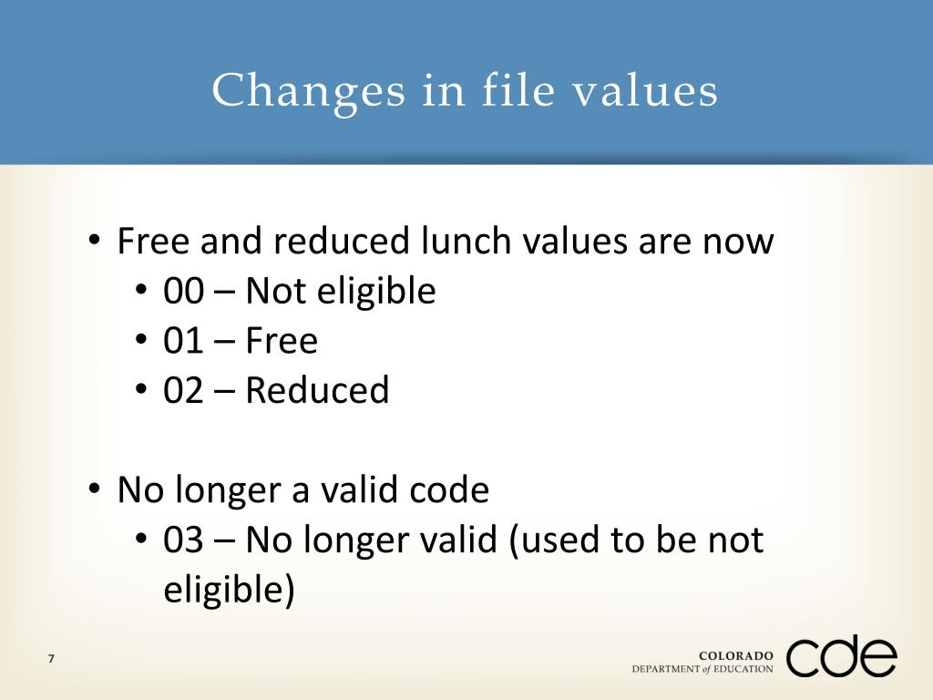 Changes in file values • Free and reduced lunch values are now • 00 – Not eligible • 01 – Free • 02 – Reduced • No longer a valid code • 03 – No longer valid (used to be not eligible) 7