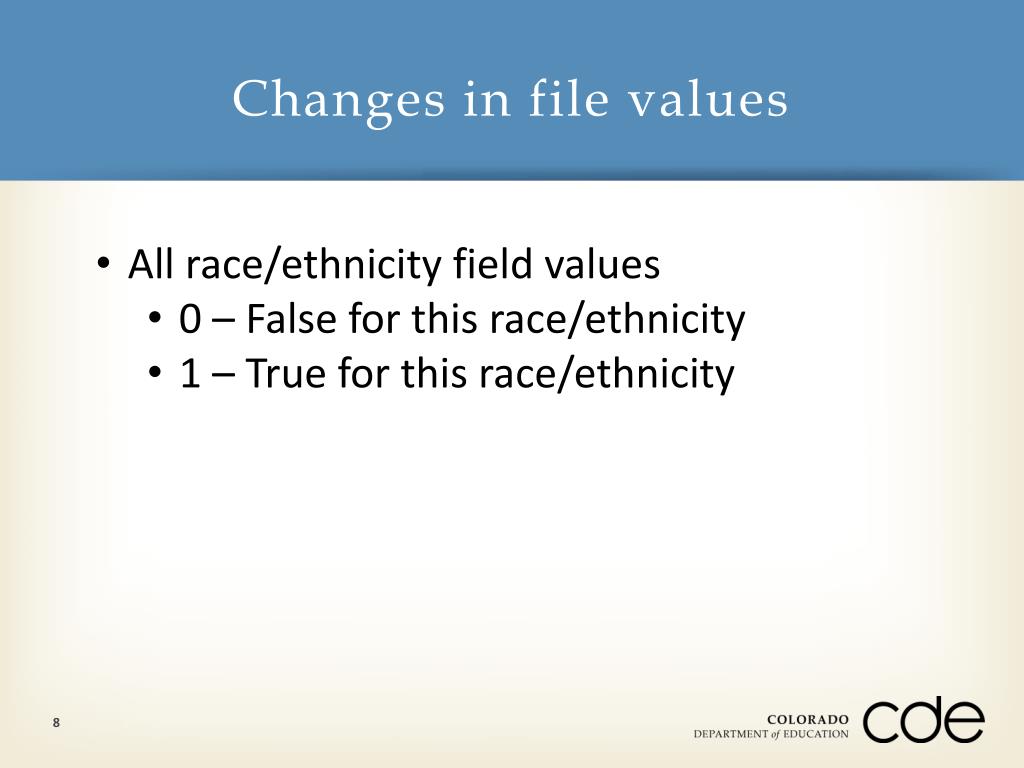 Changes in file values • All race/ethnicity field values • 0 – False for this race/ethnicity • 1 – True for this race/ethnicity 8