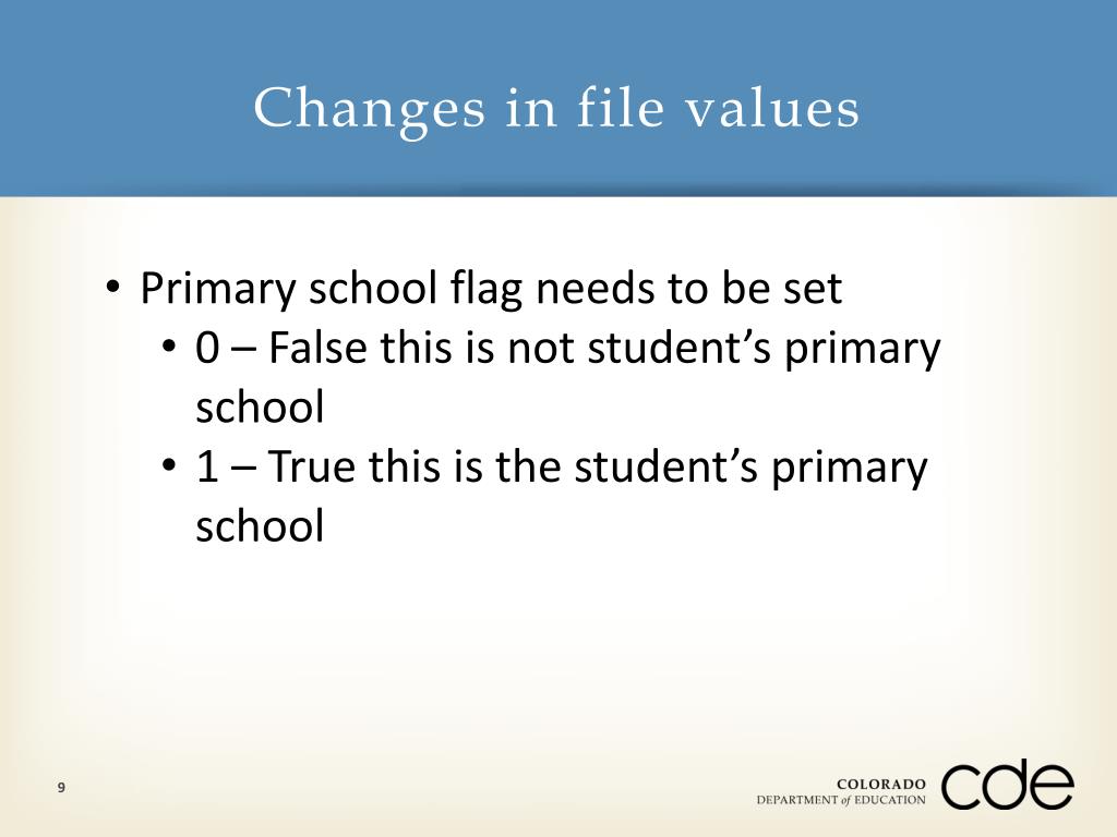 Changes in file values • Primary school flag needs to be set • 0 – False this is not student’s primary school • 1 – True this is the student’s primary school 9
