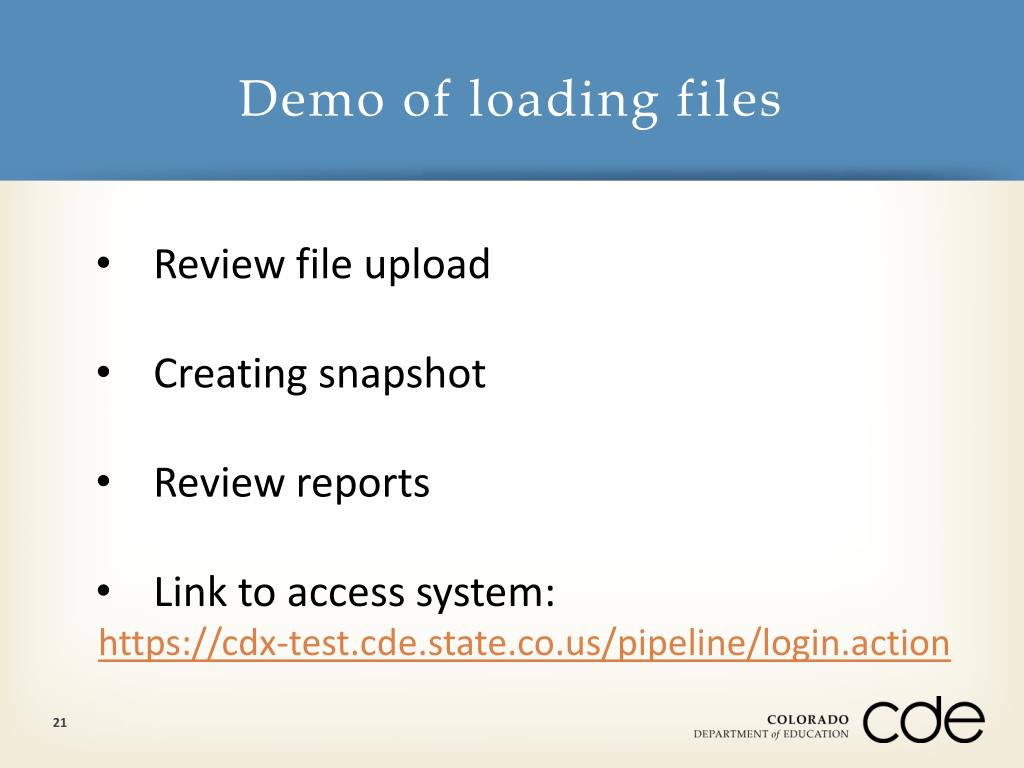 Demo of loading files • Review file upload • Creating snapshot • Review reports • Link to access system: • https://cdx-test.cde.state.co.us/pipeline/login.action 21