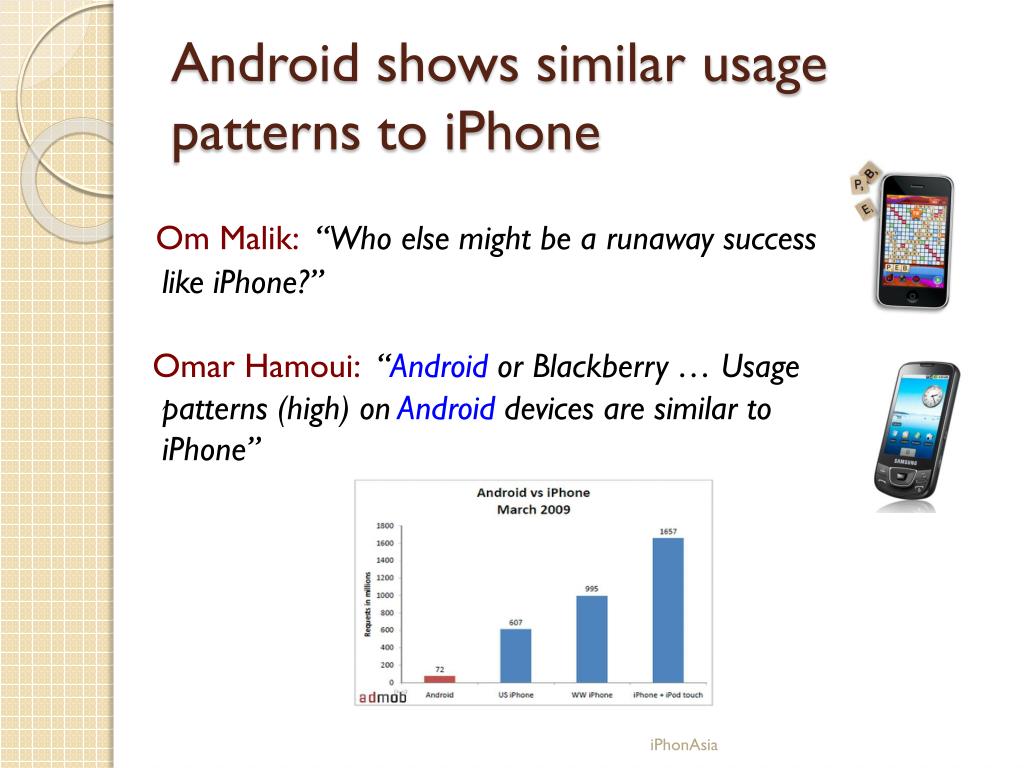 Android shows similar usage patterns to iPhone Om Malik: “Who else might be a runaway success like iPhone?” Omar Hamoui: “Android or Blackberry … Usage patterns (high) on Android devices are similar to iPhone” iPhonAsia