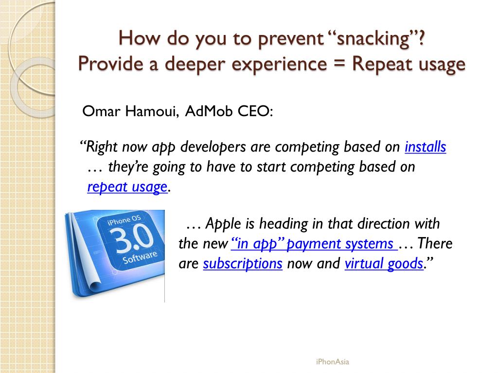 How do you to prevent “snacking”?Provide a deeper experience = Repeat usage … Apple is heading in that direction with the new “in app” payment systems … There are subscriptions now and virtual goods.” Omar Hamoui, AdMob CEO: “Right now app developers are competing based on installs … they’re going to have to start competing based on repeat usage. iPhonAsia