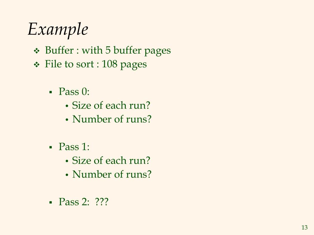 Example • Buffer : with 5 buffer pages • File to sort : 108 pages • Pass 0: • Size of each run? • Number of runs? • Pass 1: • Size of each run? • Number of runs? • Pass 2: ???