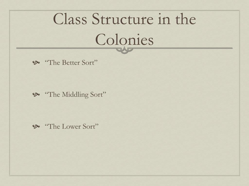Class Structure in the Colonies • “The Better Sort” • “The Middling Sort” • “The Lower Sort”
