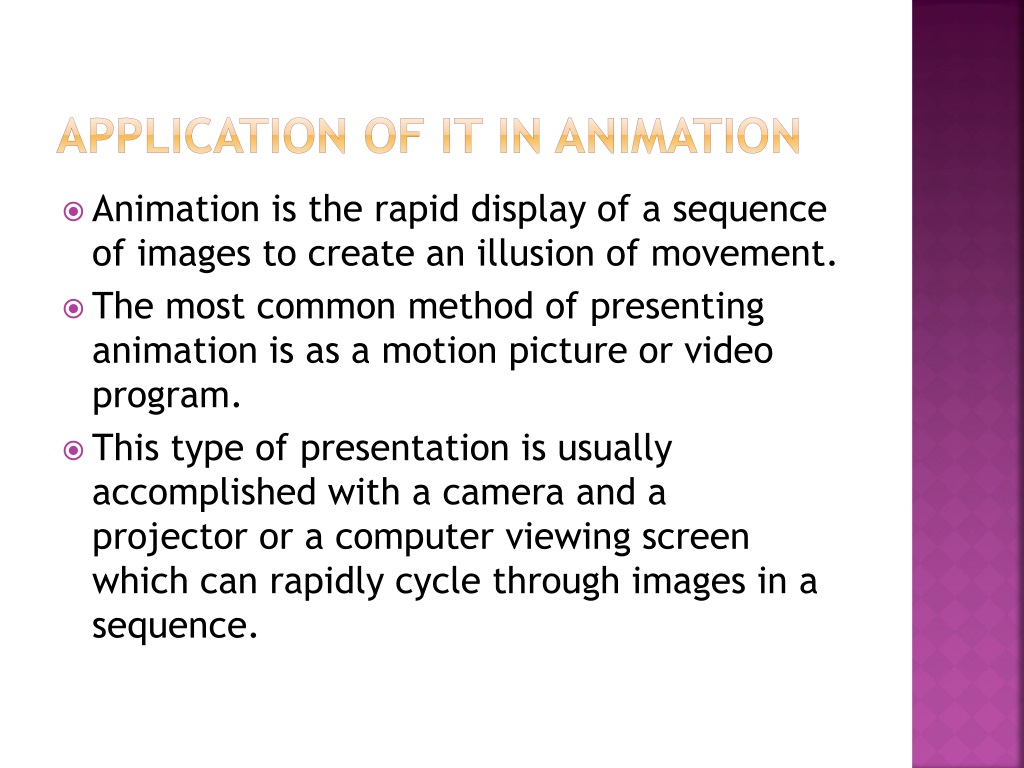 Application of it in animation • Animation is the rapid display of a sequence of images to create an illusion of movement. • The most common method of presenting animation is as a motion picture or video program. • This type of presentation is usually accomplished with a camera and a projector or a computer viewing screen which can rapidly cycle through images in a sequence.