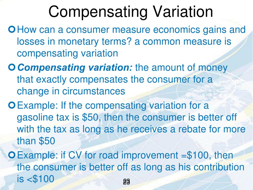 b/c 5$ fully compensate consumer from an increase in P from 0.5 to 1, the compensating variation for this P increase is $5 • the compensating variation for P reduction is -$3.75 • worked-out problem 6.2 • in-text-exercise 6.2 24