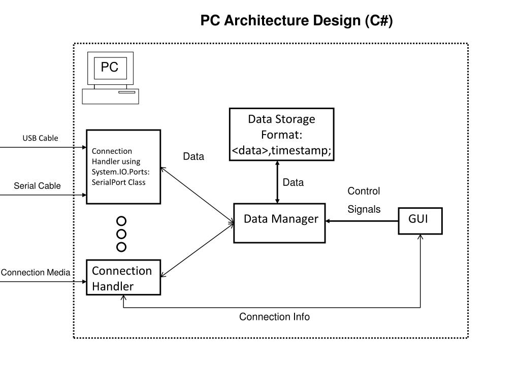 PC Architecture Design (C#) PC Data Storage Format: <data>,timestamp; USB Cable Connection Handler using System.IO.Ports: SerialPort Class Data Data Serial Cable Control Signals Data Manager GUI Connection Handler Connection Media Connection Info