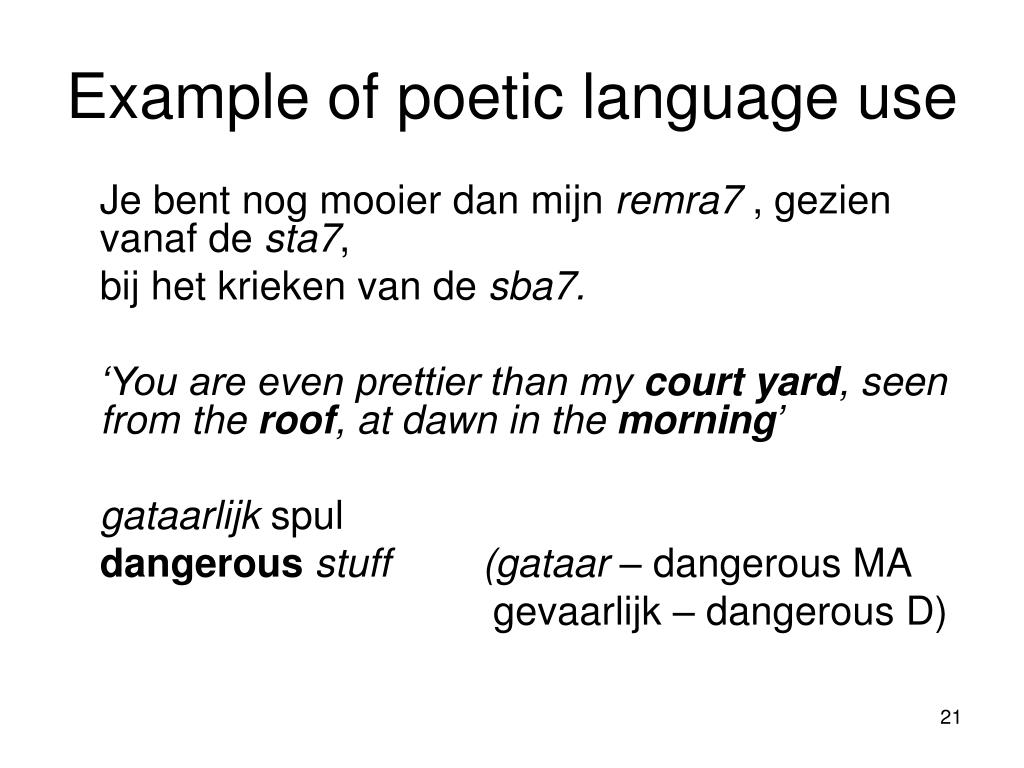Example of poetic language use Je bent nog mooier dan mijn remra7 , gezien vanaf de sta7, bij het krieken van de sba7. ‘You are even prettier than my court yard, seen from the roof, at dawn in the morning’ gataarlijk spul dangerous stuff (gataar – dangerous MA gevaarlijk – dangerous D)