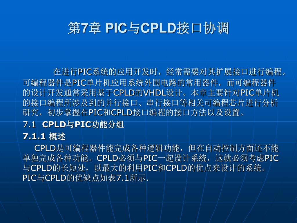 第二篇 设计篇. 第 7 章 PIC 与 CPLD 接口协调. 在进行 PIC 系统的应用开发时,经常需要对其扩展接口进行编程。可编程器件是 PIC 单片机应用系统外围电路的常用器件,而可编程器件的设计开发通常采用基于 CPLD 的 VHDL 设计。本章主要针对 PIC 单片机的接口编程所涉及到的并行接口、串行接口等相关可编程芯片进行分析研究,初步掌握在 PIC 和 CPLD 接口编程的接口方法以及设置。 7.1 CPLD 与 PIC 功能分组 7.1.1 概述