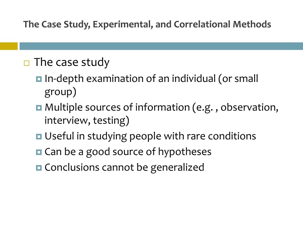The Case Study, Experimental, and Correlational Methods • The case study • In-depth examination of an individual (or small group) • Multiple sources of information (e.g. , observation, interview, testing) • Useful in studying people with rare conditions • Can be a good source of hypotheses • Conclusions cannot be generalized