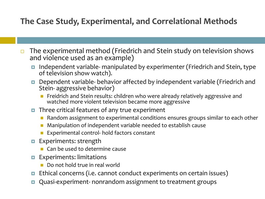 The Case Study, Experimental, and Correlational Methods • The experimental method (Friedrich and Stein study on television shows and violence used as an example) • Independent variable- manipulated by experimenter (Friedrich and Stein, type of television show watch). • Dependent variable- behavior affected by independent variable (Friedrich and Stein- aggressive behavior) • Freidrich and Stein results: children who were already relatively aggressive and watched more violent television became more aggressive • Three critical features of any true experiment • Random assignment to experimental conditions ensures groups similar to each other • Manipulation of independent variable needed to establish cause • Experimental control- hold factors constant • Experiments: strength • Can be used to determine cause • Experiments: limitations • Do not hold true in real world • Ethical concerns (i.e. cannot conduct experiments on certain issues) • Quasi-experiment- nonrandom assignment to treatment groups