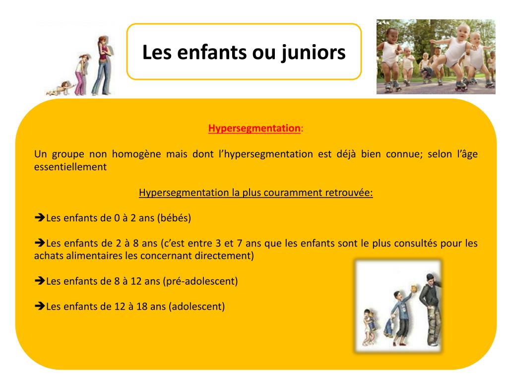 Les enfants ou juniors Hypersegmentation: Un groupe non homogène mais dont l’hypersegmentation est déjà bien connue; selon l’âge essentiellement Hypersegmentation la plus couramment retrouvée: Les enfants de 0 à 2 ans (bébés) Les enfants de 2 à 8 ans (c’est entre 3 et 7 ans que les enfants sont le plus consultés pour les achats alimentaires les concernant directement) Les enfants de 8 à 12 ans (pré-adolescent) Les enfants de 12 à 18 ans (adolescent)