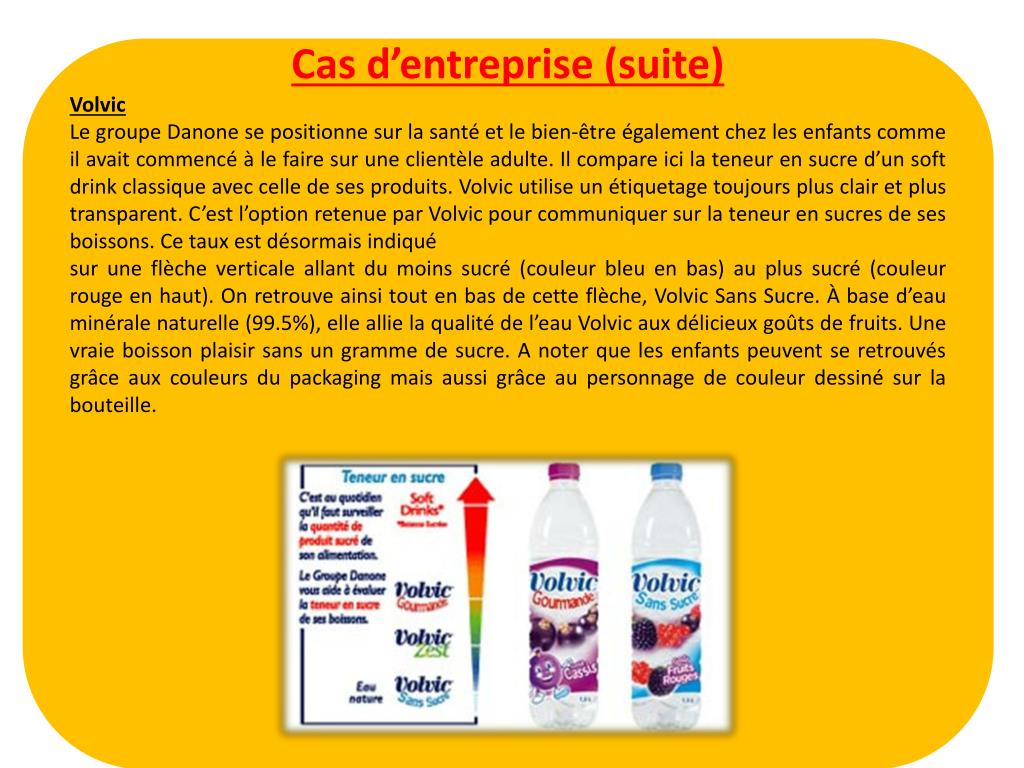 Cas d’entreprise (suite) Volvic Le groupe Danone se positionne sur la santé et le bien-être également chez les enfants comme il avait commencé à le faire sur une clientèle adulte. Il compare ici la teneur en sucre d’un soft drink classique avec celle de ses produits. Volvic utilise un étiquetage toujours plus clair et plus transparent. C’est l’option retenue par Volvic pour communiquer sur la teneur en sucres de ses boissons. Ce taux est désormais indiqué sur une flèche verticale allant du moins sucré (couleur bleu en bas) au plus sucré (couleur rouge en haut). On retrouve ainsi tout en bas de cette flèche, Volvic Sans Sucre. À base d’eau minérale naturelle (99.5%), elle allie la qualité de l’eau Volvic aux délicieux goûts de fruits. Une vraie boisson plaisir sans un gramme de sucre. A noter que les enfants peuvent se retrouvés grâce aux couleurs du packaging mais aussi grâce au personnage de couleur dessiné sur la bouteille.