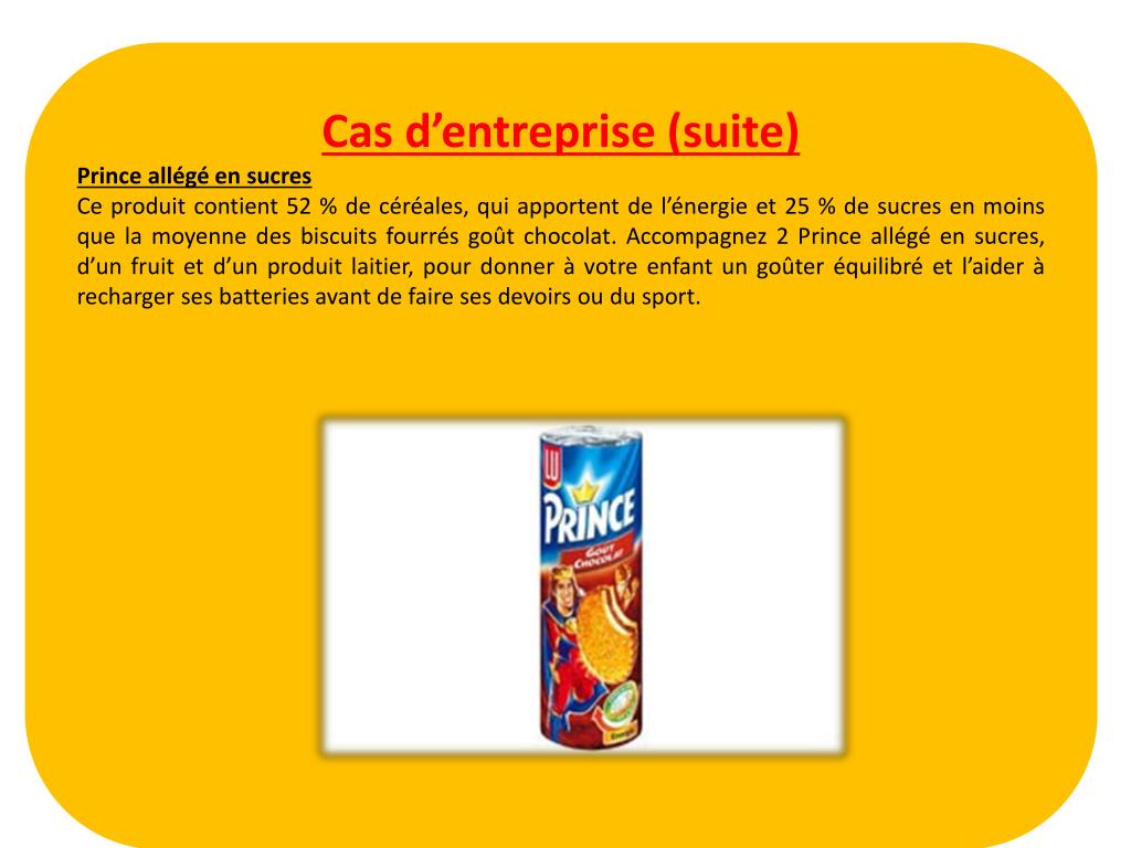 Cas d’entreprise (suite) Prince allégé en sucres Ce produit contient 52 % de céréales, qui apportent de l’énergie et 25 % de sucres en moins que la moyenne des biscuits fourrés goût chocolat. Accompagnez 2 Prince allégé en sucres, d’un fruit et d’un produit laitier, pour donner à votre enfant un goûter équilibré et l’aider à recharger ses batteries avant de faire ses devoirs ou du sport.
