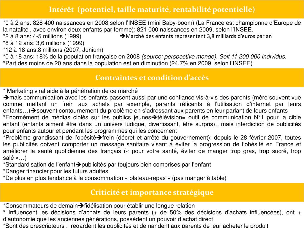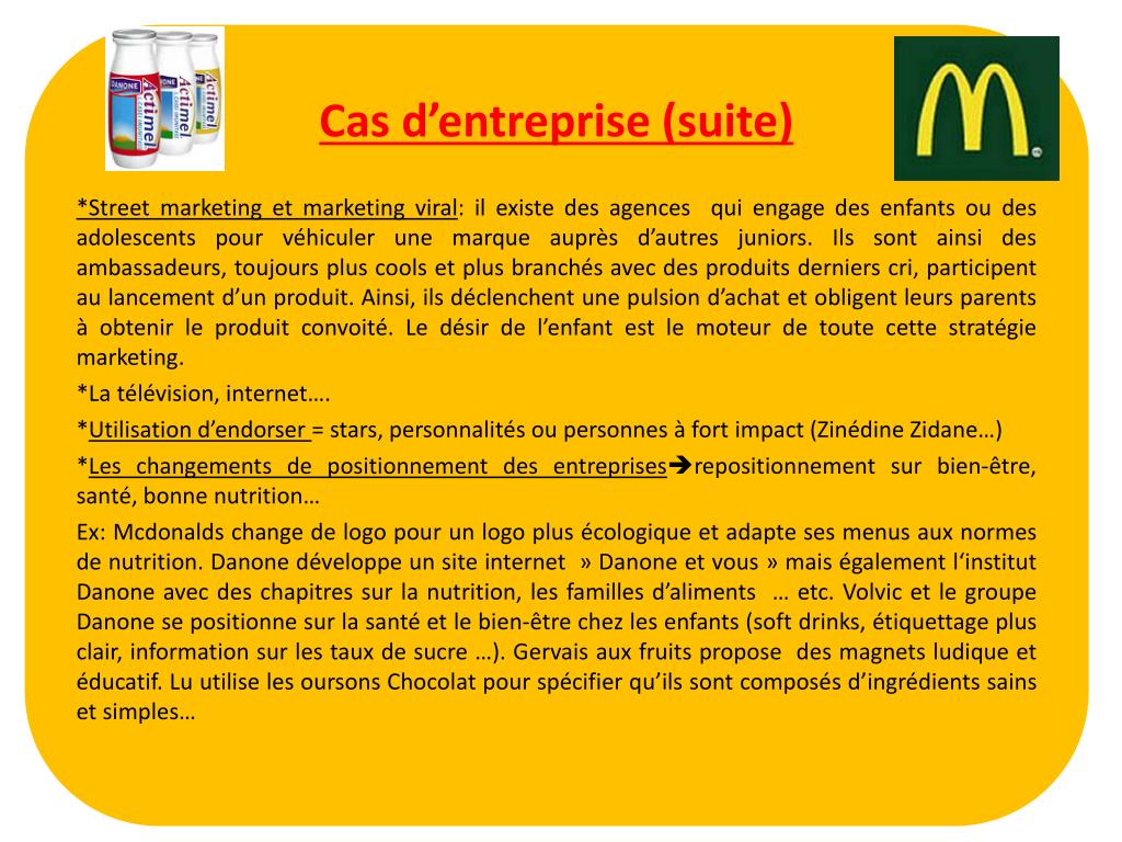 Cas d’entreprise (suite) *Street marketing et marketing viral: il existe des agences qui engage des enfants ou des adolescents pour véhiculer une marque auprès d’autres juniors. Ils sont ainsi des ambassadeurs, toujours plus cools et plus branchés avec des produits derniers cri, participent au lancement d’un produit. Ainsi, ils déclenchent une pulsion d’achat et obligent leurs parents à obtenir le produit convoité. Le désir de l’enfant est le moteur de toute cette stratégie marketing. *La télévision, internet…. *Utilisation d’endorser = stars, personnalités ou personnes à fort impact (Zinédine Zidane…) *Les changements de positionnement des entreprisesrepositionnement sur bien-être, santé, bonne nutrition… Ex: Mcdonalds change de logo pour un logo plus écologique et adapte ses menus aux normes de nutrition. Danone développe un site internet » Danone et vous » mais également l‘institut Danone avec des chapitres sur la nutrition, les familles d’aliments … etc. Volvic et le groupe Danone se positionne sur la santé et le bien-être chez les enfants (soft drinks, étiquettage plus clair, information sur les taux de sucre …). Gervais aux fruits propose des magnets ludique et éducatif. Lu utilise les oursons Chocolat pour spécifier qu’ils sont composés d’ingrédients sains et simples…